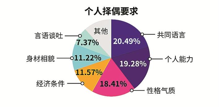 調(diào)查顯示,共同語言、個(gè)人能力、性格氣質(zhì)為單身男女在擇偶時(shí)最看重的三個(gè)方面,其次為經(jīng)濟(jì)條件、身材相貌、言語談吐。可見,相較于過去條件上的匹配,更重視精神上的契合。