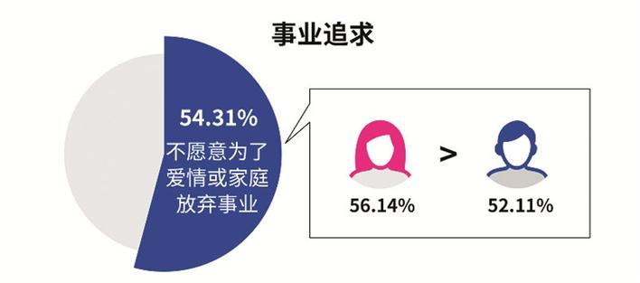 對于許多人而言,愛情和事業(yè)沖突的抉擇已經(jīng)越來越常見。調(diào)查顯示,54.31%的單身男女不愿意為了愛情或家庭放棄自己的事業(yè)。從男女差異看,56.14%的女性表示不愿意為了愛情或家庭放棄自己的職場或事業(yè),高于男性??梢?,女性對于事業(yè)的追求正在逐漸提升。
