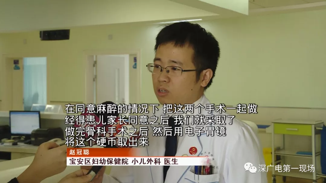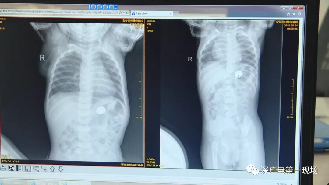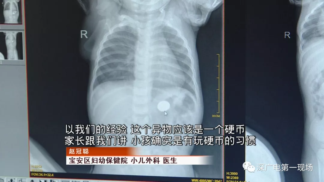 9月4號(hào),一名1歲零5個(gè)月的男嬰因在家中摔傷,被父母送到了寶安區(qū)婦幼保健院,醫(yī)生診斷為左側(cè)尺橈骨骨折。在進(jìn)行全麻手術(shù)之前,院方例行對(duì)嬰兒進(jìn)行了周身檢查。手術(shù)前,兒外科醫(yī)生趙冠聰在查看患者的胸片時(shí),發(fā)現(xiàn)這名嬰兒的胃部有一枚硬幣大小的暗影。