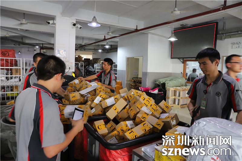 在田貝營(yíng)運(yùn)部?jī)?nèi),順豐員工使用手機(jī)掃碼后快速分揀快遞