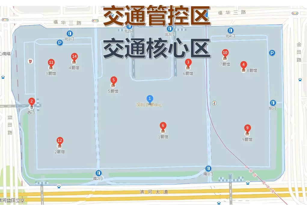福華三路西往東輔道臨時管控,其中輔道的北廣場正門段作為高交會嘉賓車輛通行通道(使用北廣場嘉賓車輛通行車證),即停即走。