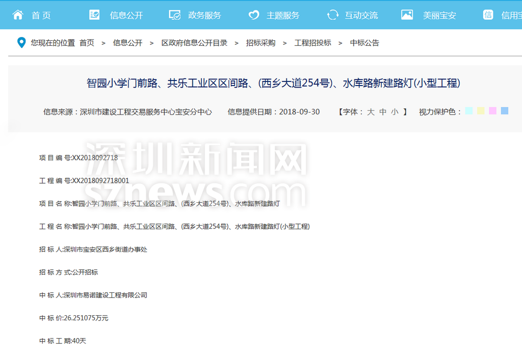 記者從寶安西鄉(xiāng)街道官網(wǎng)中標(biāo)公告獲悉,智園小學(xué)門前路工程施工中標(biāo)單位是深圳市易諾建設(shè)工程有限公司,中標(biāo)工期是40天。據(jù)招標(biāo)公告顯示計(jì)劃開竣工時間是2018年10月08日至2018年11月18日。網(wǎng)友希望施工能夠如期完工,道路能夠早日恢復(fù)暢通,施工期間,最好能夠?qū)⑹┕龅睾腿诵械栏糸_,確保學(xué)生人身安全。