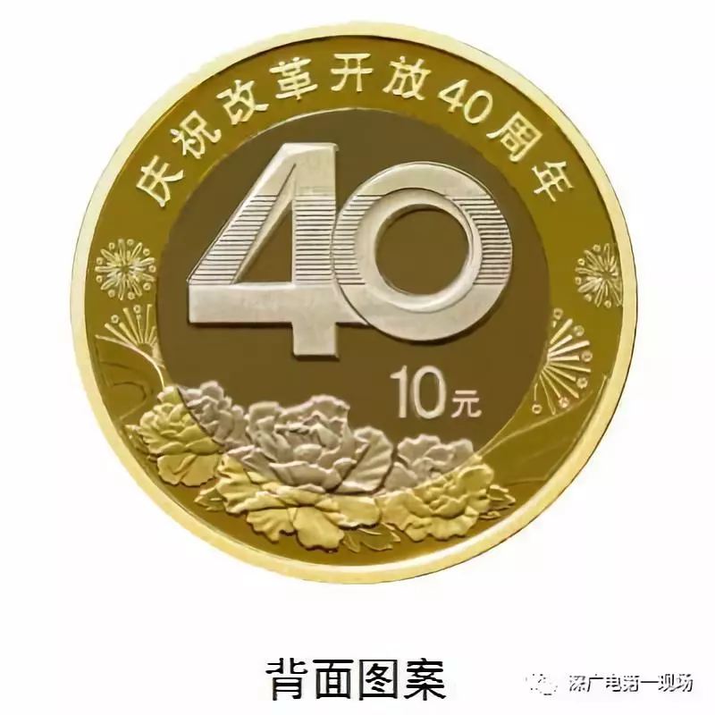 雙色銅合金紀(jì)念幣背面主景圖案為阿拉伯?dāng)?shù)字“40”,背景圖案為牡丹花、飄帶和禮花。主景圖案上方刊“慶祝改革開(kāi)放40周年”字樣,右下方刊面額“10元”字樣。