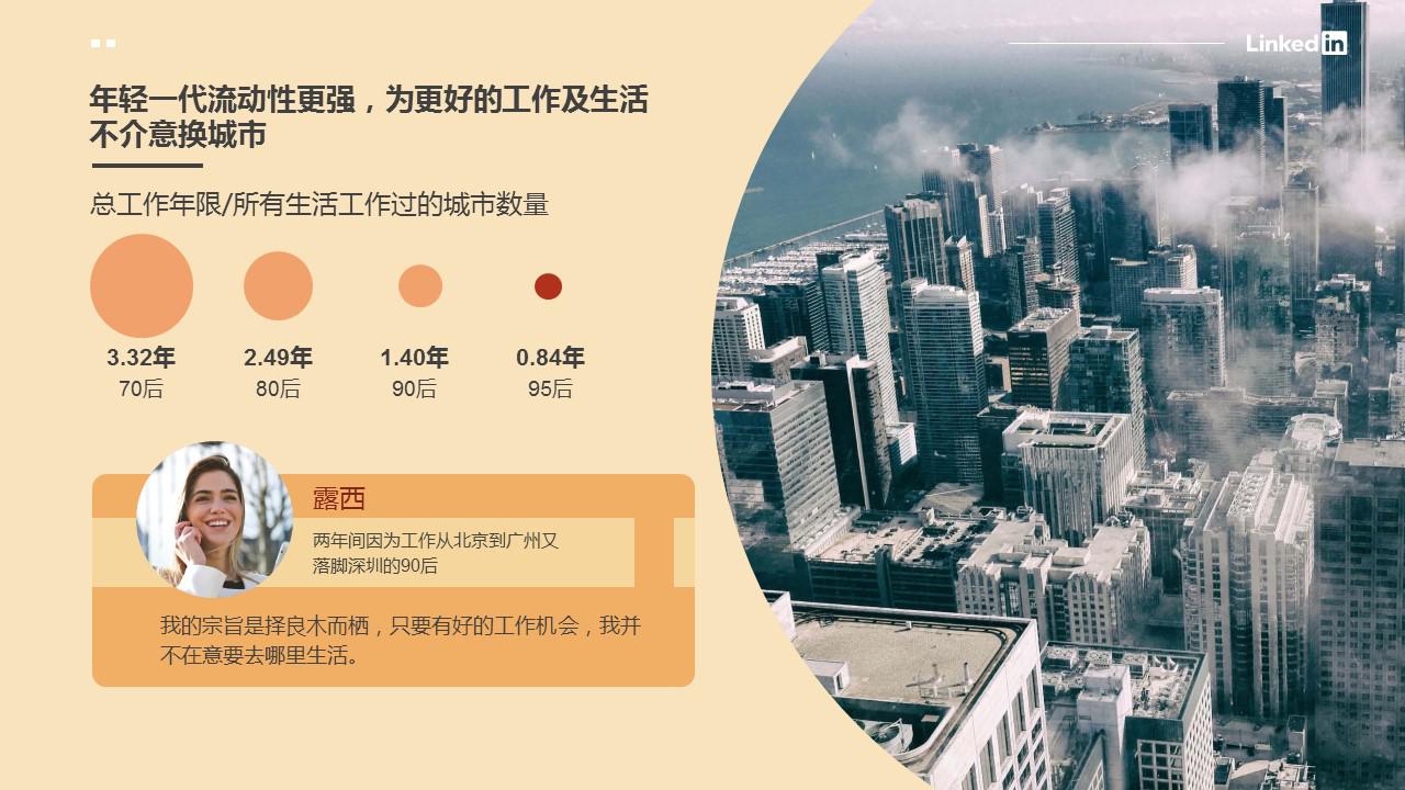 不論是因?yàn)楦玫墓ぷ鳈C(jī)會還是更理想的生活方式,新一代90/95后職場人都表現(xiàn)得更加勇敢和有魄力,“不將就”或許是他們最好的代名詞。畢業(yè)兩年間已經(jīng)經(jīng)歷從北京跳到廣州、又最終落腳深圳的90后露西表示:“不論是工作還是生活的城市,我都不會給自己太多限制,根本的原則就是擇良木而棲?,F(xiàn)在許多城市對年輕人有很多利好政策,工作機(jī)會也很多,我也想多嘗試一些不同的選擇,年輕的時(shí)候就應(yīng)該多嘗試?!?/p>