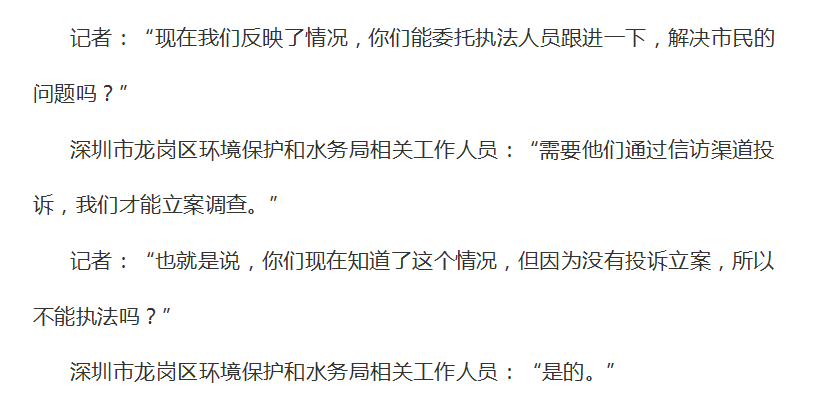 以下是記者與深圳市龍崗區(qū)環(huán)境保護(hù)和水務(wù)局信訪部門(mén)工作人員的部分對(duì)話(huà):