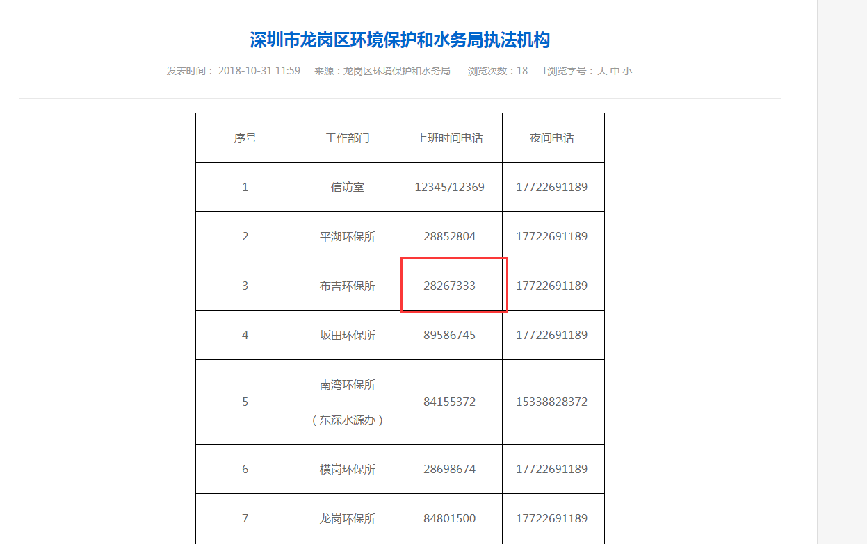 深圳市龍崗區(qū)環(huán)境保護(hù)和水務(wù)局官網(wǎng)掛出的布吉環(huán)保所電話(huà)
