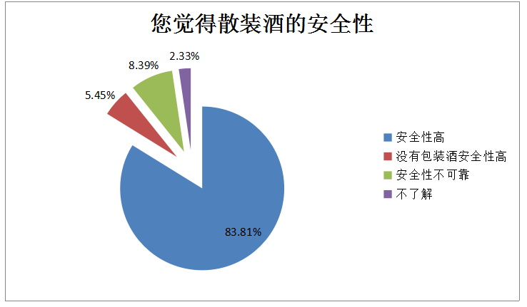 深圳人對(duì)散裝酒安全性的評(píng)價(jià)如何?83.81%的網(wǎng)民還是認(rèn)為安全性高;只有8.39%的網(wǎng)民和5.45%的網(wǎng)民認(rèn)為安全性不可靠、沒(méi)有包裝酒安全性高。