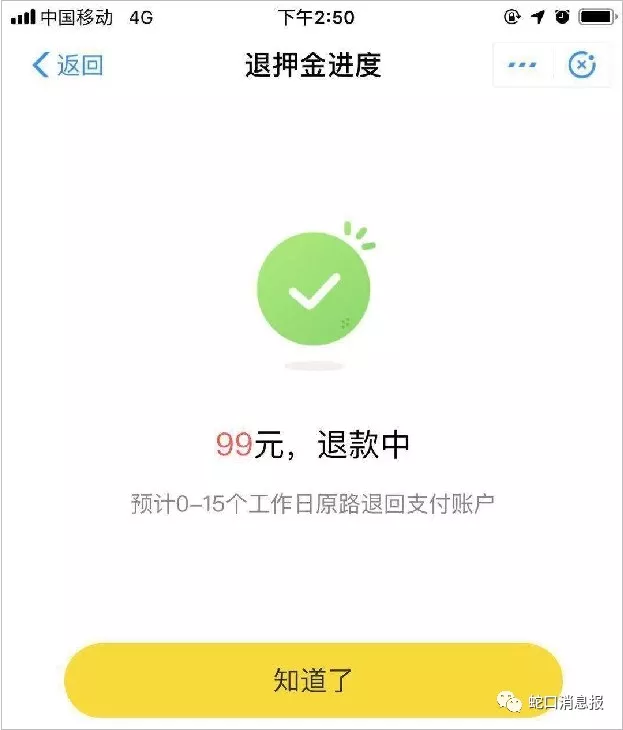 與曹女士不同,市民楊女士則是聽聞了“ofo押金提取遭遇超時”等消息后,在10月28日申請?zhí)崛⊙航稹km然提取時,頁面上稱該押金“預(yù)計(jì)0—15個工作日退回支付賬戶”,但已經(jīng)等了快1個月,楊女士還是沒有等到這筆錢。