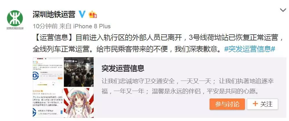 而據@深圳地鐵運營19點44分消息稱,3號線荷坳站已恢復正常運營,全線列車正常運營。