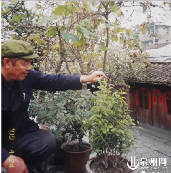 新門街西段臨街一戶人家的二樓露臺,老人家栽花種草,露臺外邊就是新門街,看得見對面是低矮的老厝。(許志榮 攝)