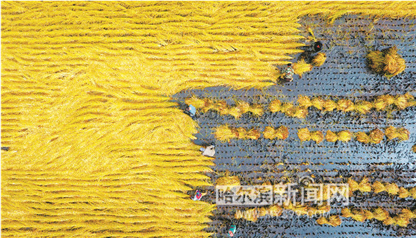 在五常營(yíng)城子村一望無垠的稻田上,農(nóng)民們正在手工收割水稻。