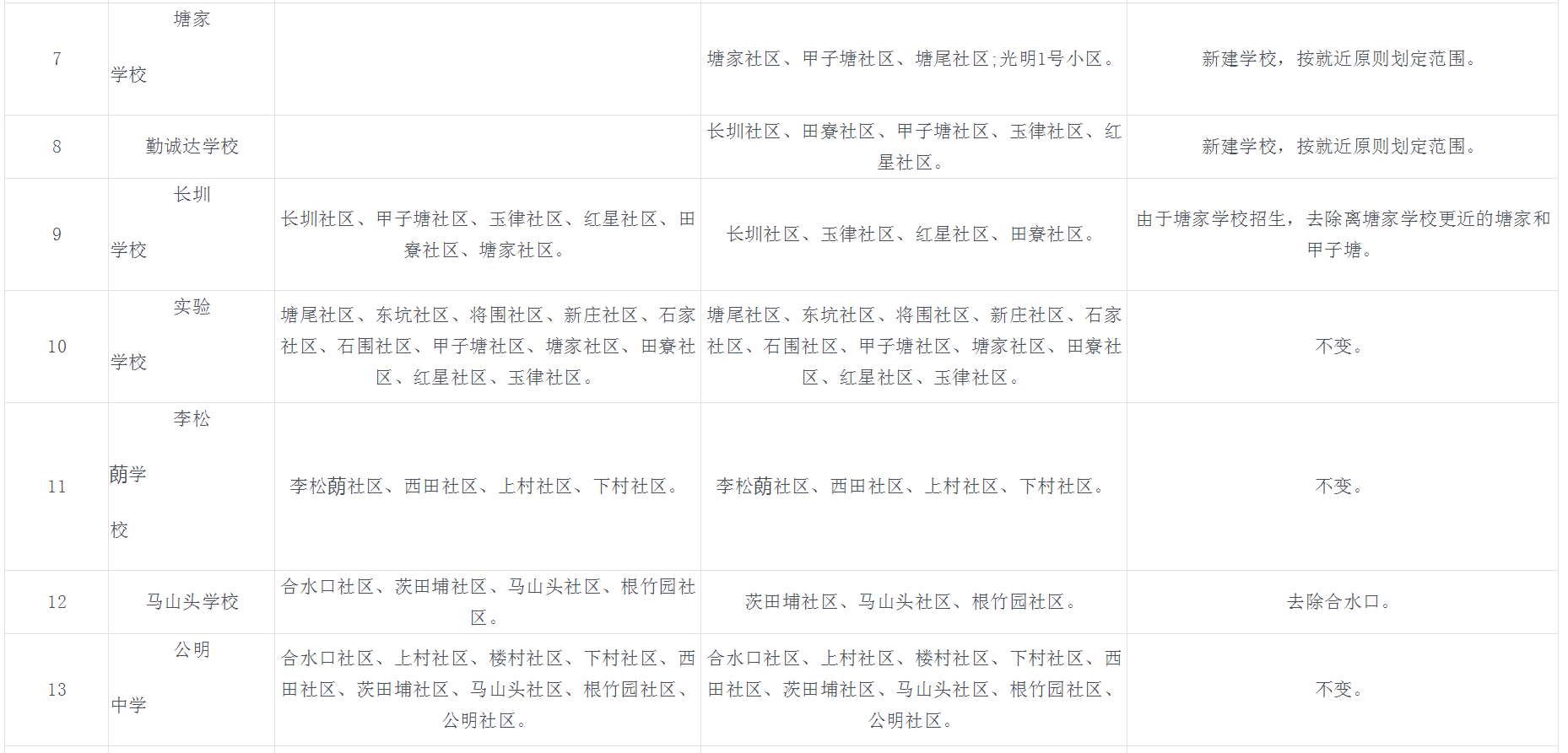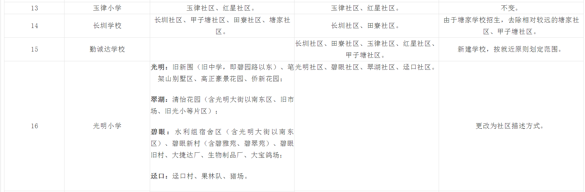據(jù)悉,2019年光明區(qū)招生原則是原有學(xué)校招生范圍盡量保持不變,新增學(xué)校招生范圍根據(jù)招生規(guī)模、生源情況等按就近原則劃定。由于增加了勤誠達(dá)學(xué)校、信宏城小學(xué)、新城學(xué)校、塘家學(xué)校、白花學(xué)校等5所新建學(xué)校,鳳凰學(xué)校擴(kuò)建項目也已完成,因此,招生片區(qū)擬做調(diào)整為:白花社區(qū)不再安排至光明中學(xué);光明外國語學(xué)校招生去除田寮、長圳、甲子塘片區(qū);光明1號小區(qū)劃歸較近的塘家學(xué)校和鳳凰學(xué)校招生;馬山頭學(xué)校招生去除合水口片區(qū);光明第二中學(xué)招生去除相對較遠(yuǎn)的塘尾片區(qū)。公明二小、下村小學(xué)招生去除相對較遠(yuǎn)的公明社區(qū);長圳學(xué)校招生去除相對較遠(yuǎn)的塘家社區(qū)、甲子塘社區(qū)。鳳凰學(xué)校招生去除白花,增加光明社區(qū)。