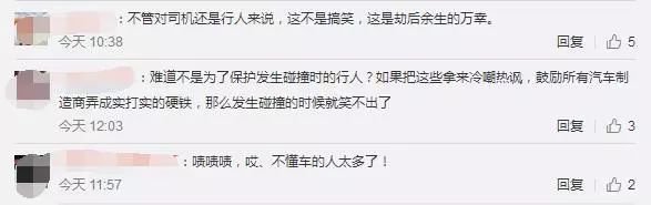 也有網友表示:"不管對司機還是行人來說,這不是搞笑,這是劫后余生的萬幸""防撞效果很好啊,本身就是要緩沖的""塑料懟鋼圈不就這樣?""難道不是為了保護發(fā)生碰撞時的行人?"。