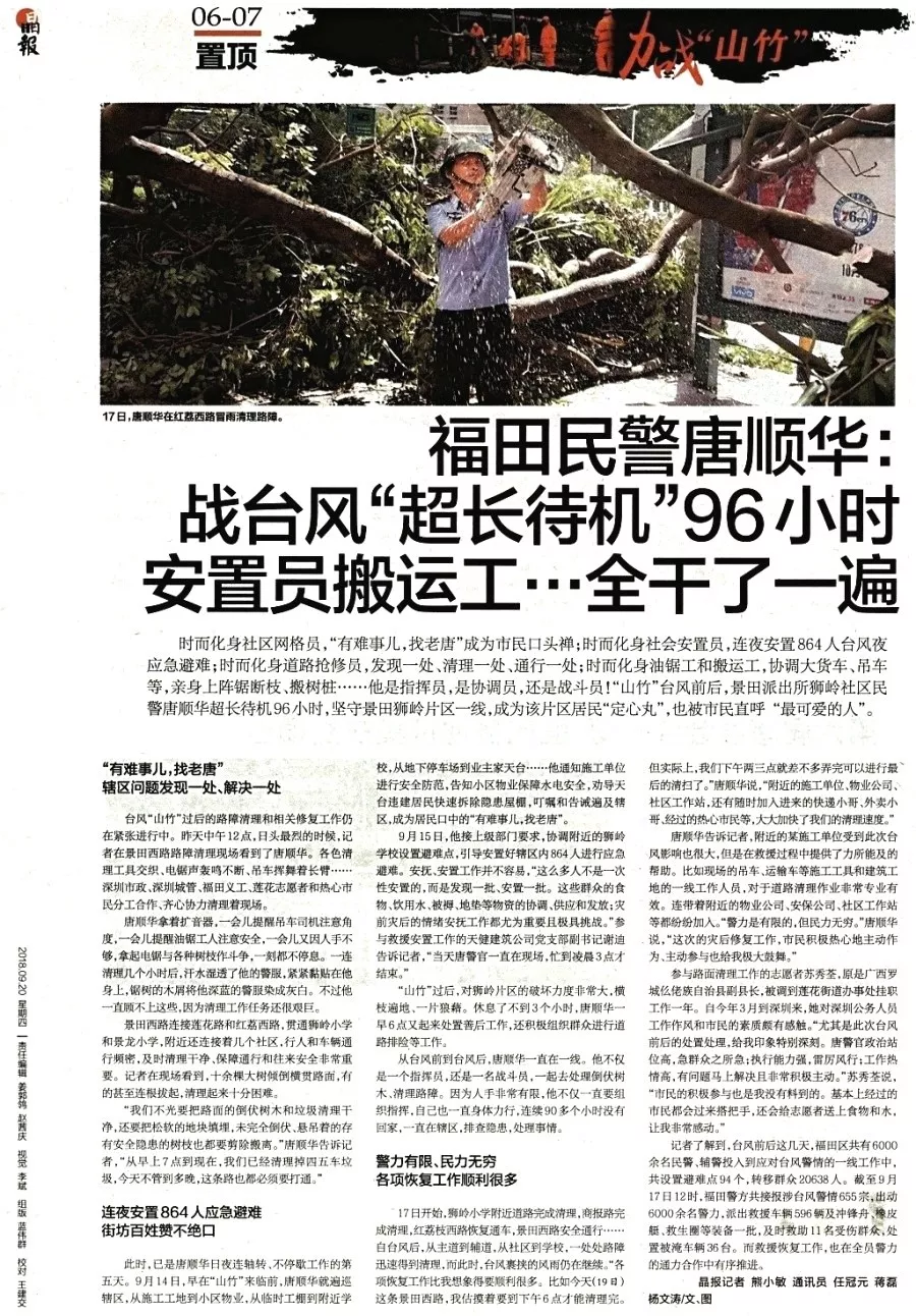 ★★深圳遭遇三十年來(lái)最強(qiáng)臺(tái)風(fēng)“山竹”襲擊,景田派出所民警唐順華堅(jiān)守景田獅嶺片區(qū),頂風(fēng)冒雨搶險(xiǎn)救災(zāi),處理倒伏樹(shù)木、清理路障,連續(xù)90多個(gè)小時(shí)沒(méi)有回家。