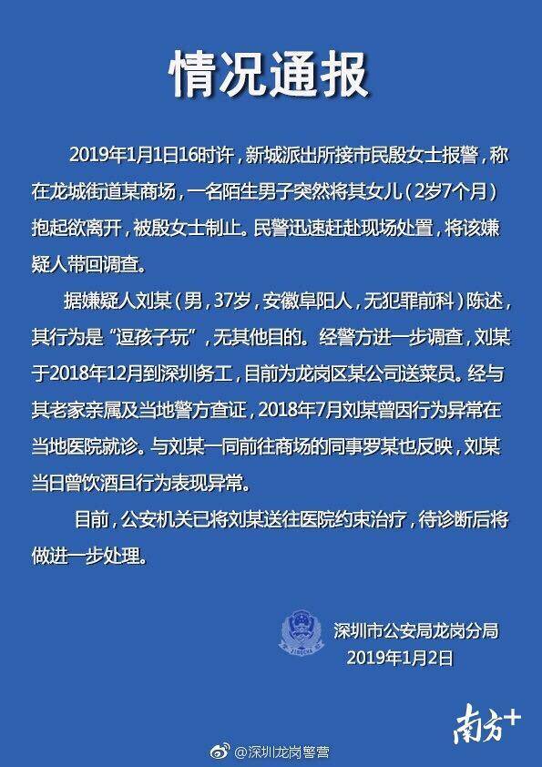 1月2日,深圳市公安局龍崗分局發(fā)布情況通報稱:已將劉某送往醫(yī)院約束治療,待診斷后將做進一步處理。