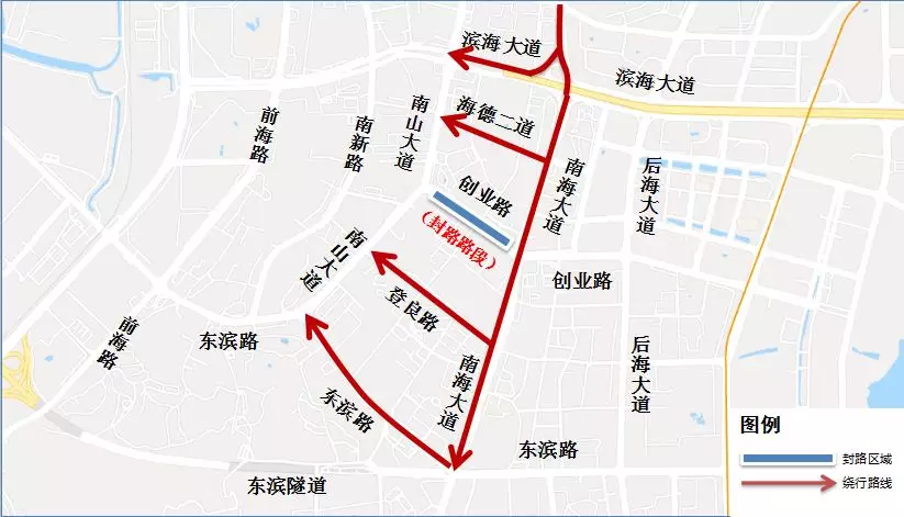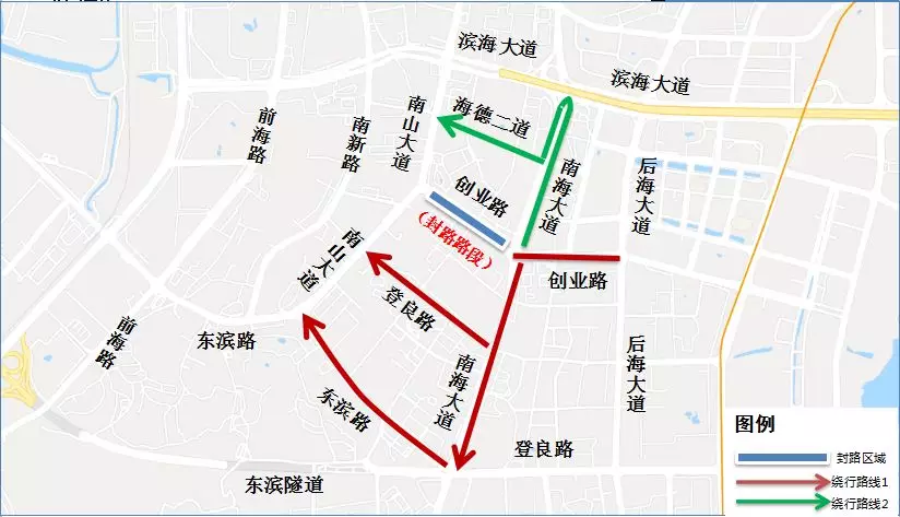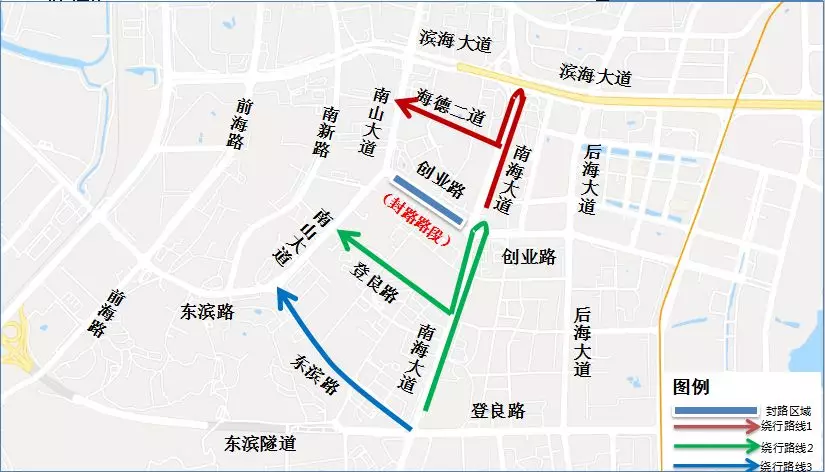 原經(jīng)南海大道創(chuàng)業(yè)路口轉(zhuǎn)入創(chuàng)業(yè)路西行,前往南山大道的車輛,可按以下路線繞行
