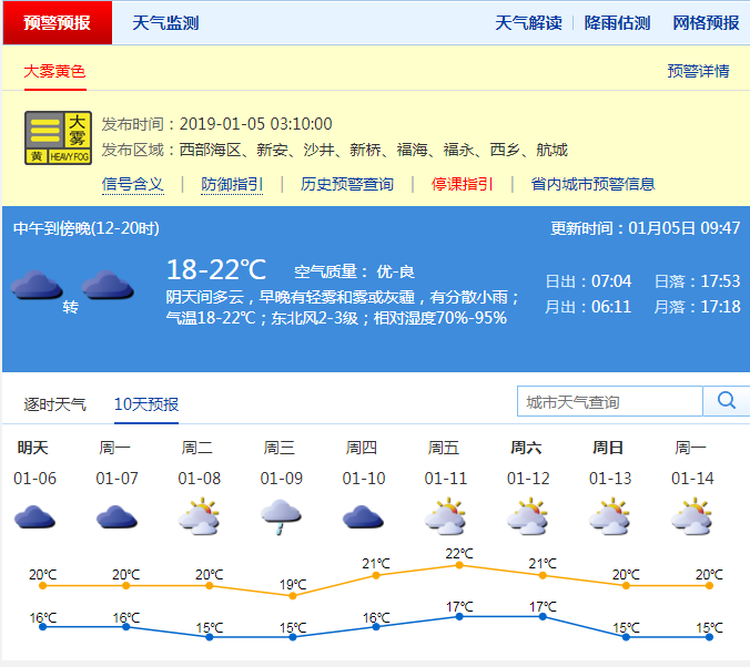 深圳新聞網(wǎng)2019年1月5日訊(記者 施冰冰)據(jù)深圳市氣象局預計5日傍晚至9日受弱冷空氣頻繁影響,氣溫小幅波動,早晚有輕霧,間中有零星小雨,部分時間可見陽光;10-11日多云,氣溫上升。