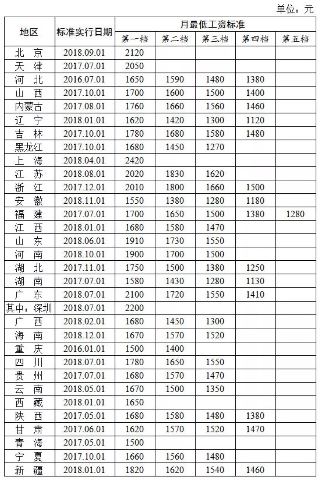 ①人社部10日公布全國各地區(qū)月最低工資標(biāo)準(zhǔn)情況(截至2018年12月),其中,上海月最低工資標(biāo)準(zhǔn)達到2420元,為全國最高。上海、廣東、北京、天津、江蘇、浙江這6個省份月最低工資標(biāo)準(zhǔn)超過2000元。(深圳最低工資標(biāo)準(zhǔn)已于2018年8月1日起調(diào)整,全日制就業(yè)勞動者最低工資標(biāo)準(zhǔn)為2200元/月,非全日制就業(yè)勞動者小時最低工資標(biāo)準(zhǔn)為20.3元/小時。)