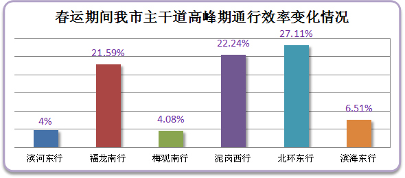經對我市城區(qū)主干道高峰期車流量監(jiān)測,預計春運期間我市早晚高峰道路日趨順暢,全市各條主干道及進出關道路平均通行效率提高一成,北環(huán)東行、泥崗路西行行車效率提升最為明顯。