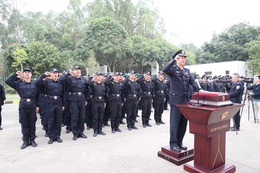 “我宣誓,忠于中華人民共和國憲法,維護憲法權(quán)威,履行法定職責(zé),忠于祖國,忠于人民,恪盡職守,廉潔奉公,接受人民監(jiān)督,為建設(shè)富強民主文明和諧美麗的社會主義現(xiàn)代化強國奮斗!”鏗鏘誓言,猶在耳畔。活動中,深圳監(jiān)獄監(jiān)獄長蔡曙光,帶領(lǐng)70名新入職警察面對國徽、手撫憲法,許下了他們忠于祖國、忠于人民的錚錚誓言,這也是深圳監(jiān)獄對新入職警察開展集中的入職憲法宣誓。