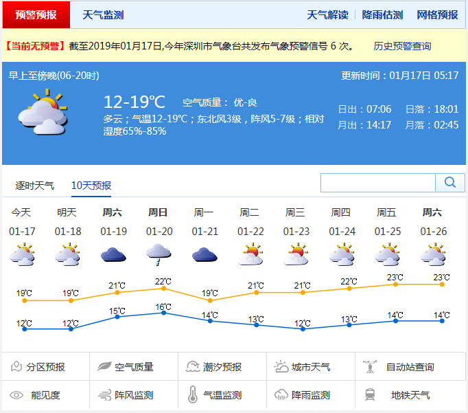 市氣象臺還發(fā)布2019年春運天氣趨勢,預計今年春運天氣影響與去年相當,未來45天有3次冷空氣過程,分別出現(xiàn)在1月21日、26日和2月1日 -2日前后,深圳最低氣溫10 ℃左右,天氣陰冷伴有大風,同期南方有階段性雨雪冰凍天氣。2月4日 -2月10日,無強冷空氣影響我市。
