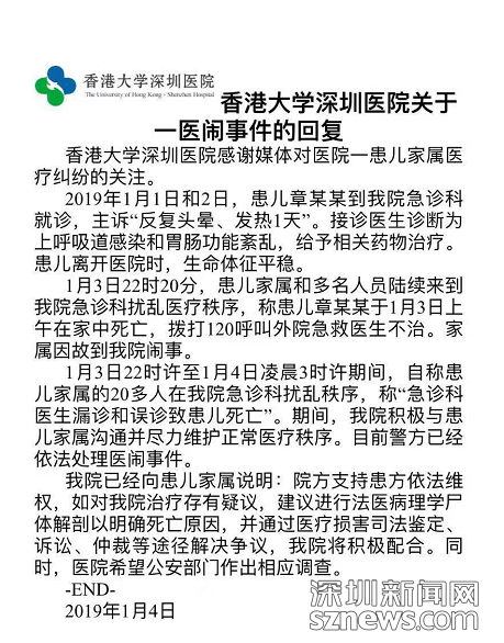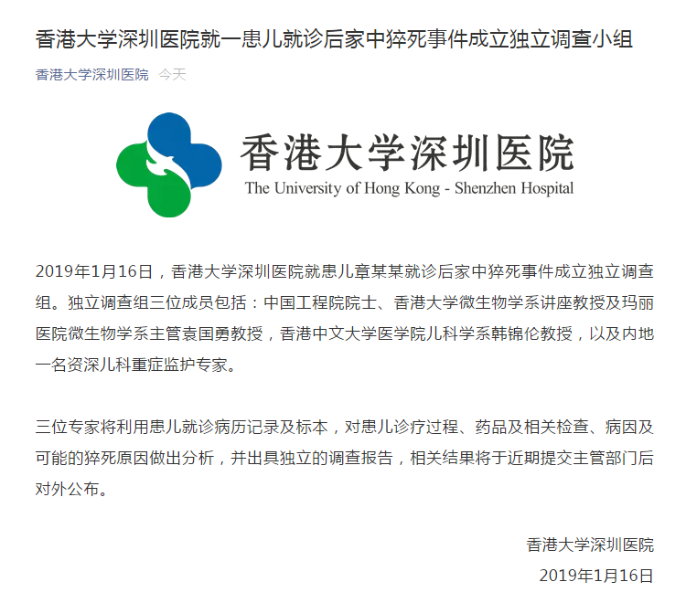 1月16日,香港大學(xué)深圳醫(yī)院就患兒章某某就診后家中猝死事件成立獨立調(diào)查組,待調(diào)查完畢后將把相關(guān)結(jié)果提交主管部門并對外公布。