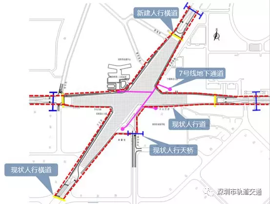 行人可利用平交路口、既有人行天橋、地下通道、7號(hào)線4個(gè)出入口過(guò)街。
