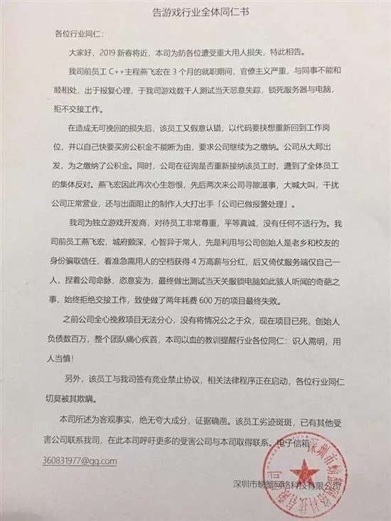 從微博大V“首席內(nèi)幕官”曬出的信息顯示,涉事程序員名叫“燕飛宏”,依仗服務(wù)端僅自己一人,捏著公司命脈,恣意妄為,在游戲測試當天關(guān)服鎖電腦,拒絕交接工作,致使做了2年耗費600萬元的項目最終失敗。