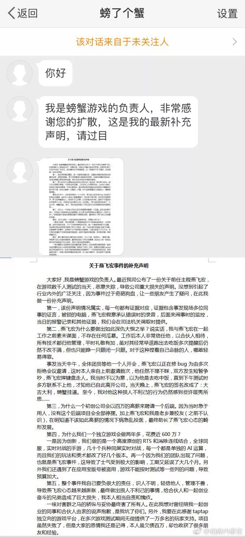 該微博一同曝光的還有一份“關(guān)于燕飛宏的補充聲明”,自稱是螃蟹游戲負責人的“螃了個蟹”表示,自己與燕飛宏在一起工作之前素未謀面,不存在任何瓜葛,工作后非常信任他,以合伙人相待,所有技術(shù)都歸他管理,因為捏著公司命脈,對其經(jīng)常早退也只能睜一只眼閉一只眼。