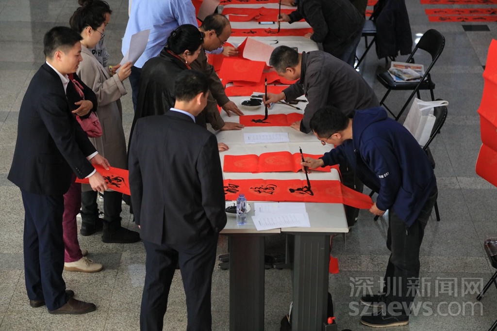 過年貼春聯(lián),是中華民族的傳統(tǒng)習(xí)俗之一。可以說,春聯(lián)一出,年味十足。記者在深圳商報(bào)大廈一樓活動(dòng)現(xiàn)場看到,工作人員早已準(zhǔn)備好了春聯(lián)的紅紙和筆墨,多位書法了得的記者編輯揮毫潑墨,創(chuàng)作出了一幅幅寓意喜慶吉祥的對聯(lián),并免費(fèi)贈(zèng)送給同事。不少人為了能拿到新鮮出爐的春聯(lián),提前在現(xiàn)場排隊(duì)等候。