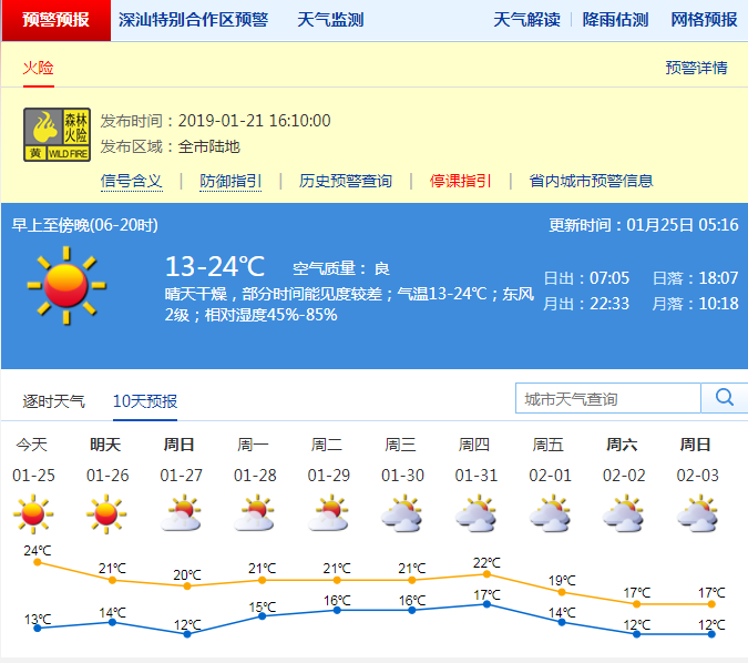 值得注意的是,深圳市24-28日,持續(xù)晴天干燥,晝夜溫差大,白天溫暖,部分時間有輕微到輕度霾,其中26-27日氣溫小幅下降;展望29-30日多云,濕度上升。