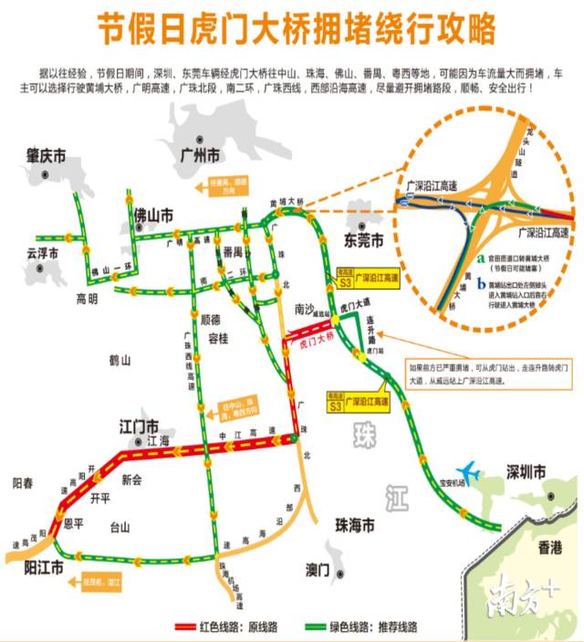 (2)廣深沿江高速—東二環(huán)高速—廣珠北線—廣澳高速—西部沿海高速—沈海高速—往佛山、中山、江門方向。