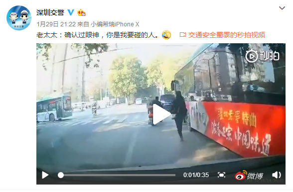 深圳zaker2019年1月31日訊 1月29日,深圳交警微博發(fā)布了一段視頻,并配文"老太太:確認(rèn)過眼神,你是我要碰的人。"