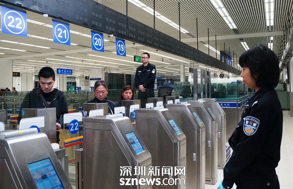 2月3日2:00,皇崗邊檢站十三隊分隊長云娜在皇崗口岸出境大廳自助查驗通道監(jiān)護(通訊員 黃俊生攝)
