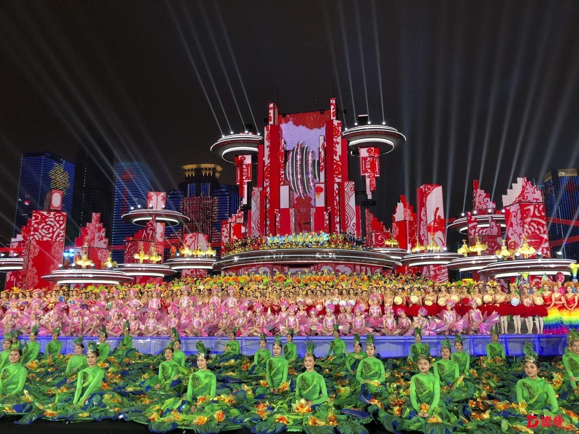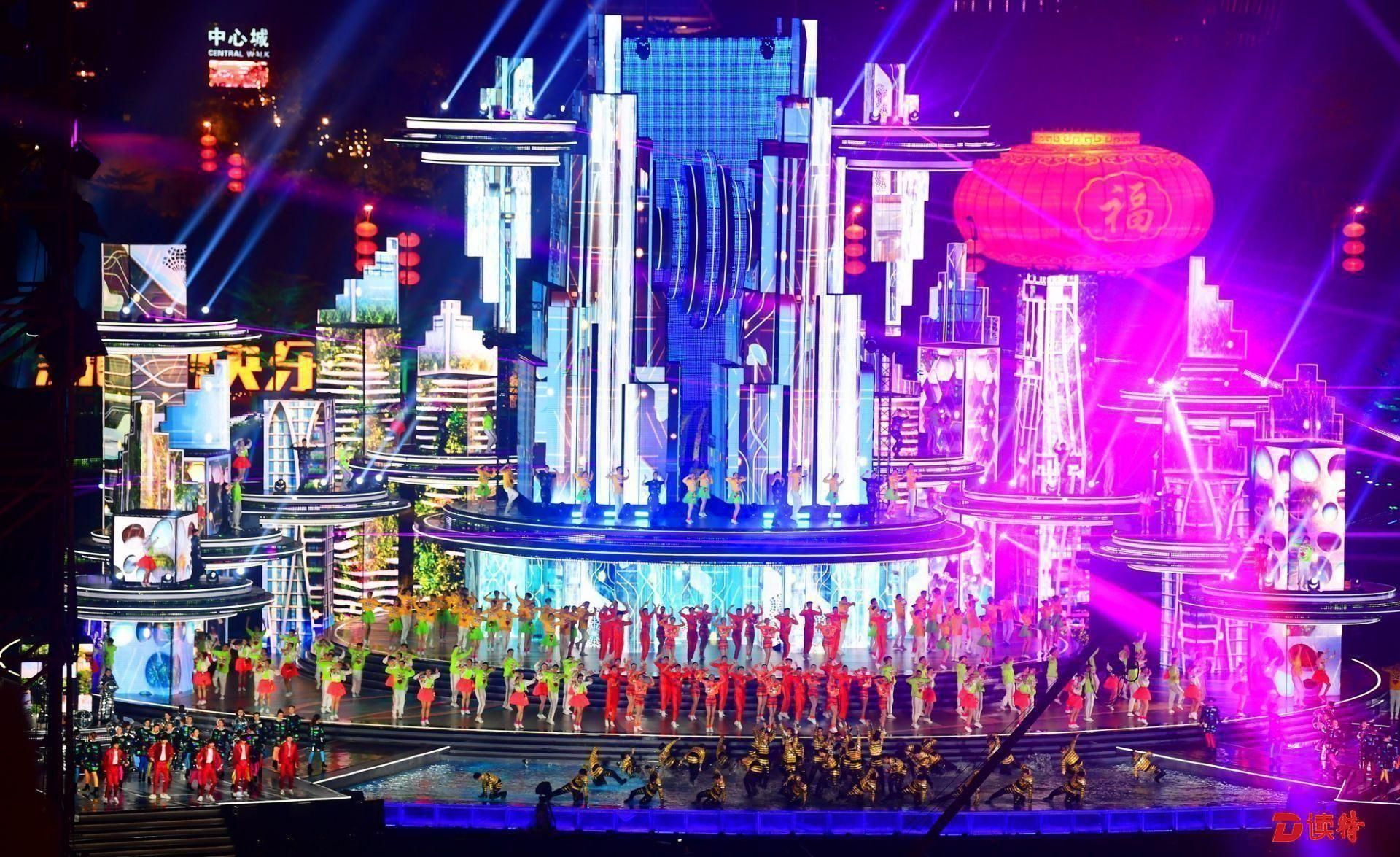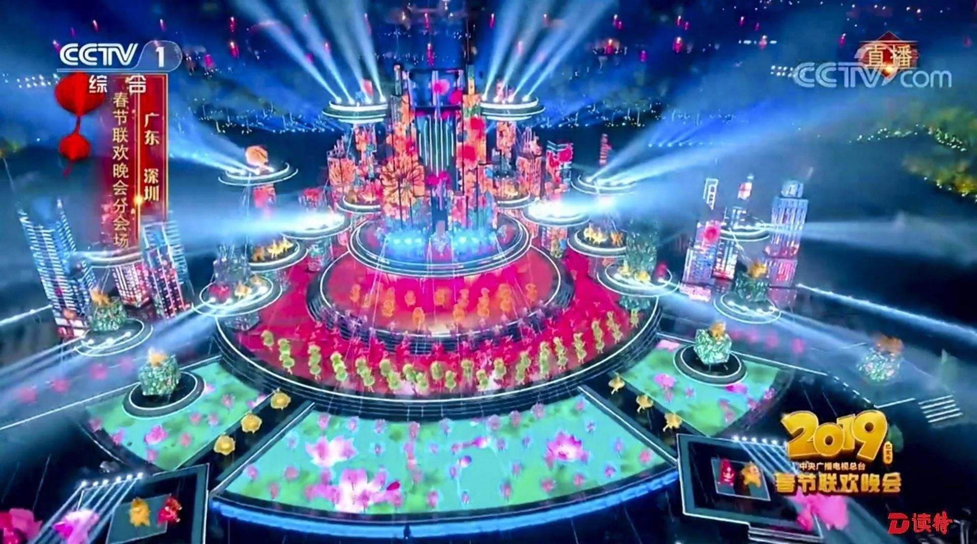 除夕夜,深圳市中心區(qū)燈光璀璨。2019央視春晚深圳分會(huì)場(chǎng)——深圳市民中心廣場(chǎng)上演精彩“深圳七分鐘”。