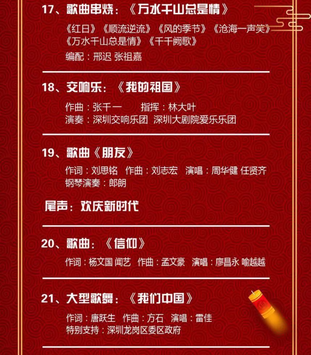 這場晚會的作品原創(chuàng)味十足。在20多個節(jié)目中,相當一部分音樂作品來自深圳本土原創(chuàng),開場的《城市歡樂頌》、譚維維演唱的《南方有座山》、陳思思演唱的《南國花兒艷》、廖昌永/喻越越演唱的《信仰》、雷佳演唱的《我們中國》等等,這些原創(chuàng)歌曲集中展現了深圳30多年來在音樂創(chuàng)作上的成果。