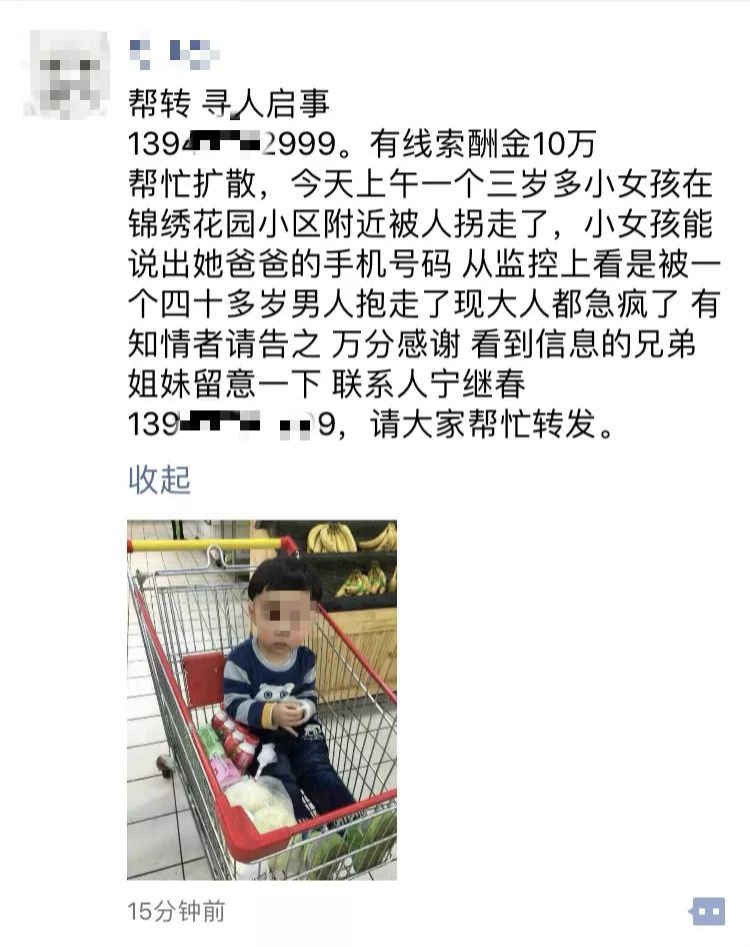 深圳晚報2019年2月13日訊 2月10日晚間一則內(nèi)容為"家長懸賞10萬元尋找3歲被拐女孩"的消息,刷爆了很多網(wǎng)友的微信朋友圈。"幫忙擴(kuò)散,3歲女孩在錦繡花園小區(qū)被拐走,家長拿出10萬元酬金尋人……"網(wǎng)友紛紛傳遞愛心的同時,也在為女孩的安危捏著一把汗。然而,記者調(diào)查發(fā)現(xiàn)實(shí)際情況卻并非如此......