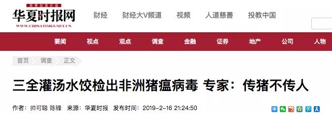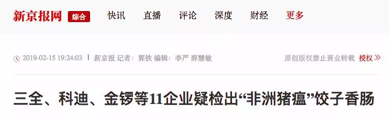 據(jù)紅星新聞報(bào)道,多家媒體稱,2月9日,湖南省湘西自治州重大動(dòng)物疫病防制指揮部辦公室接到省防治重大動(dòng)物疫病指揮部辦公室通知,要求瀘溪縣重大動(dòng)物疫病防制指揮部辦公室對(duì)來(lái)源于吉首市凌云冷凍食品批發(fā)部?jī)鰩?kù)的產(chǎn)品進(jìn)行抽樣,在瀘溪縣好又多和萬(wàn)家福兩家超市共抽取4個(gè)批次12份樣品,經(jīng)州動(dòng)物疫病預(yù)防控制中心檢測(cè),其中由河南三全食品有限公司生產(chǎn)批次為20190113H的“三全灌湯水餃”3份樣品為非洲豬瘟病毒核酸陽(yáng)性。