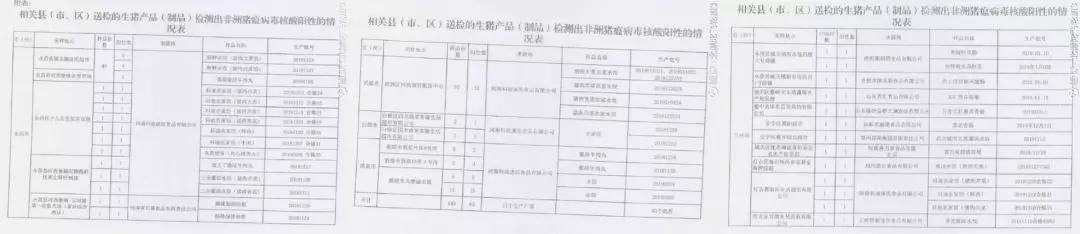 該網(wǎng)友貼出的3張照片顯示為“相關(guān)縣(市、區(qū))送檢的生豬產(chǎn)品(制品)檢測(cè)出非洲豬瘟病毒核酸陽(yáng)性的情況表”,共計(jì)11個(gè)廠家、40批次產(chǎn)品的83個(gè)樣品檢出陽(yáng)性,采樣地點(diǎn)在甘肅的蘭州市、武陵市、白銀市、酒泉市、金昌市等。被通報(bào)的速凍品牌及企業(yè)包括三全、鄭榮、科迪、上海國(guó)福龍鳳等,其中標(biāo)稱河南科迪速凍食品有限公司生產(chǎn)的水餃、肉丸等產(chǎn)品,至少有67份樣品檢出非洲豬瘟病毒核酸陽(yáng)性,為陽(yáng)性檢出樣品最多的品牌。