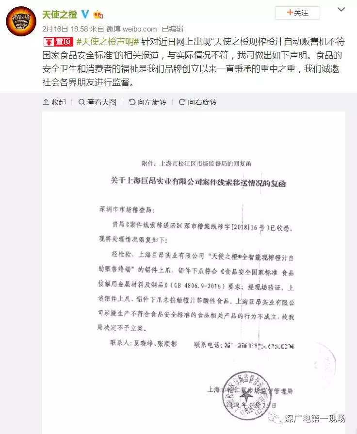 2月16日,“天使之橙”官方發(fā)表聲明,稱上海市松江區(qū)市場監(jiān)管局經(jīng)過現(xiàn)場檢查,并送第三方檢測機(jī)構(gòu)檢測,認(rèn)為“上下爪”并不會接觸橙汁等酸性食品,巨昂方面涉嫌違反《食品安全法》的相關(guān)行為不成立,該局不予立案。