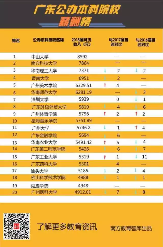 不久前,省教育廳發(fā)布了《2018年高校畢業(yè)生就業(yè)質(zhì)量年度報(bào)告》,全省本科畢業(yè)生平均月薪為4522元。已公布相關(guān)數(shù)據(jù)的51所本科高校中,有35所超過了全省本科畢業(yè)生的平均月薪,其中中山大學(xué)8592元、南方科技大學(xué)7864元、華南理工大學(xué)7371元名列前3位,均超過7000元。