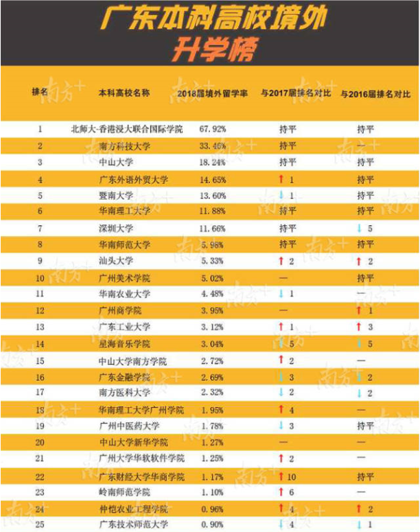 廣東外語(yǔ)外貿(mào)大學(xué)境外留學(xué)人數(shù)顯著提升,2018屆共有275人升入世界排名前100名的高校深造。兩所內(nèi)地與香港合作創(chuàng)辦的大學(xué)在境外留學(xué)率上處于全省前列。北京師范大學(xué)-香港浸會(huì)大學(xué)聯(lián)合國(guó)際學(xué)院持續(xù)多年保持全省第1位,此次共有811人留學(xué),其中481人就讀世界前100名的大學(xué)。香港中文大學(xué)(深圳)僅公布總升學(xué)率65.67%,該校就業(yè)處相關(guān)負(fù)責(zé)人介紹,升學(xué)率中絕大部分是境外留學(xué),176名學(xué)生平均每人收到3份世界知名大學(xué)錄取通知書(shū)。