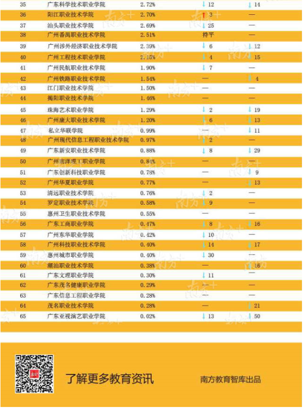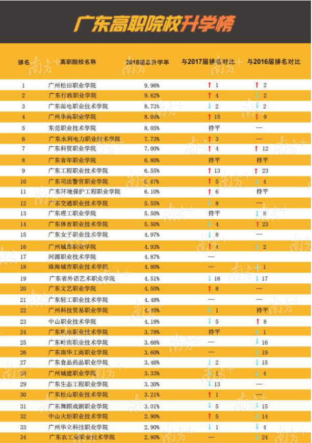 近3年各高職升學(xué)數(shù)據(jù)顯示,越來(lái)越多畢業(yè)生通過(guò)升學(xué)提升自身競(jìng)爭(zhēng)力,尤其2018屆升學(xué)率增長(zhǎng)明顯。其中有7所高職院校的畢業(yè)生升學(xué)率達(dá)到或超過(guò)7%,分別是廣州松田職業(yè)學(xué)院9.96%、廣東行政職業(yè)學(xué)院9.62%、廣東郵電職業(yè)技術(shù)學(xué)院8.73%、廣州華商職業(yè)學(xué)院8.06%、東莞職業(yè)技術(shù)學(xué)院8.05%、廣東水利電力職業(yè)技術(shù)學(xué)院7.73%和廣東科貿(mào)職業(yè)學(xué)院7.00%。