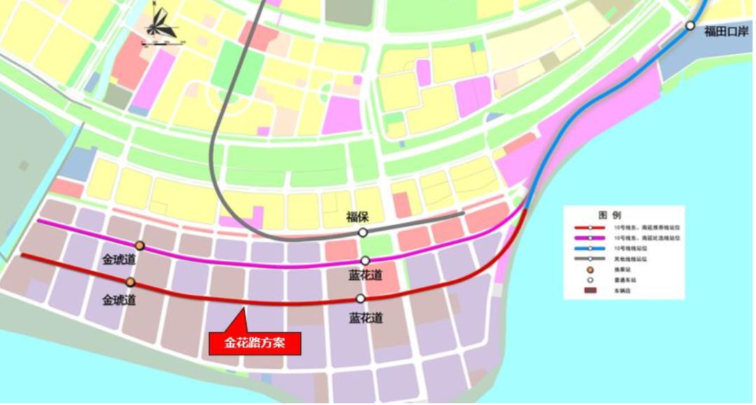10號(hào)線南延是福田保稅區(qū)內(nèi)的普速線路,主要功能為聯(lián)系河套-福保片區(qū)的各功能區(qū)域,服務(wù)福田保稅區(qū)內(nèi)就業(yè)崗位。南延線線路起自在建10號(hào)線福田口岸站,向西南敷設(shè),進(jìn)入保稅區(qū)后沿金花路敷設(shè),至藍(lán)花道設(shè)藍(lán)花道站,至金花路和平冠道交叉口設(shè)金琥道站,以金花路和金葵路交叉口為終點(diǎn)。線路全長(zhǎng)約3.0km,采用地下敷設(shè)。