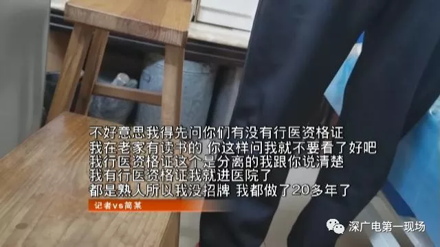 簡某的名片上,印著他是醫(yī)學(xué)院畢業(yè),有20多年治療經(jīng)驗,他的治療對骨折脫位通風(fēng)腰突癥有特效,甚至半身不遂后遺癥都可以治。名片上,簡某有兩個營業(yè)點,分別在龍崗坂田和布吉。但地址只顯示大范圍,沒有房號。原來,找他看病,先得電話預(yù)約,然后他才告訴你具體房號。昨天,記者想辦法預(yù)約到簡某,他說可以在坂田五和路附近的吉豐樓給記者看病。記者來到現(xiàn)場,看到樓下沒有任何標(biāo)識,不過電梯里有塊不大的牌子,寫著“跌打骨傷”電話號碼和門鈴0305字樣。