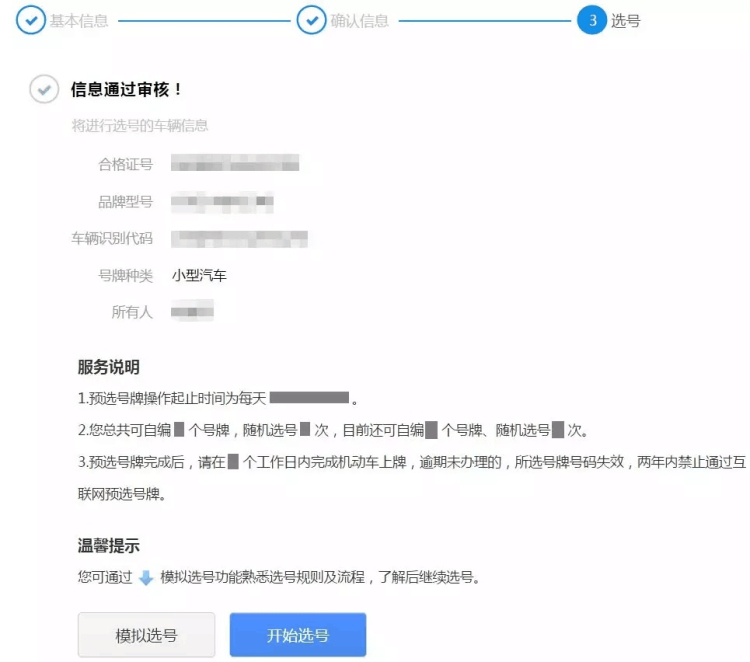 系統(tǒng)核查通過(guò)后會(huì)進(jìn)入選號(hào)服務(wù)說(shuō)明,用戶可以看到之前提交的信息,閱讀服務(wù)說(shuō)明后,點(diǎn)擊"開(kāi)始選號(hào)"按鈕開(kāi)始進(jìn)行選號(hào)操作。