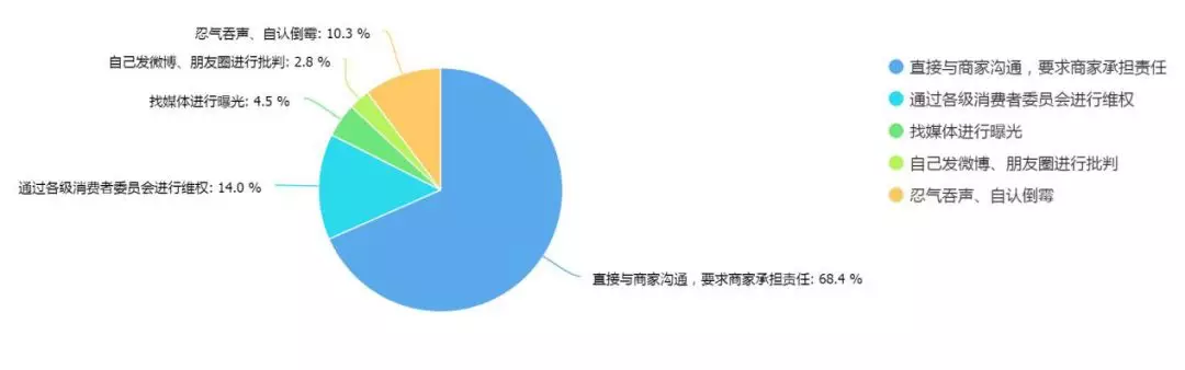有68.4%的受訪者在遇到消費(fèi)侵權(quán)后選擇直接與商家溝通,要求商家承擔(dān)責(zé)任,10.4%的受訪者會選擇忍氣吞聲、自認(rèn)倒霉;其中男性消費(fèi)者更傾向于找媒體曝光,而女性消費(fèi)者則傾向于忍氣吞聲。