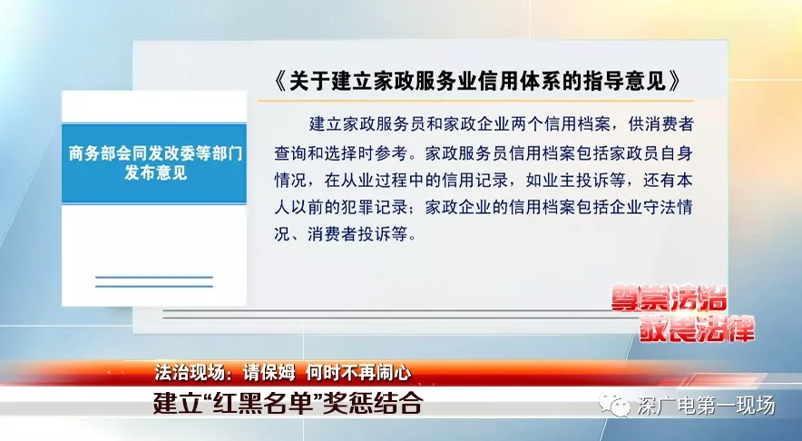 趙坤:在深圳,請保姆,育嬰師,鐘點工等等是很多家庭的剛需,但是很多人也抱怨說,要請個好的保姆阿姨實在是太難了,有些雇主因為各種原因家里來來去去換了好幾個阿姨,有些甚至還跟家政公司調(diào)解不成鬧上了法庭。防患于未然,商務部等部委這次發(fā)布的意見,建立信用檔案,可謂來的正當時。我們也期待深圳能盡快出臺家政行業(yè)信用平臺,期待深圳的家政行業(yè)能更加透明,更加規(guī)范。