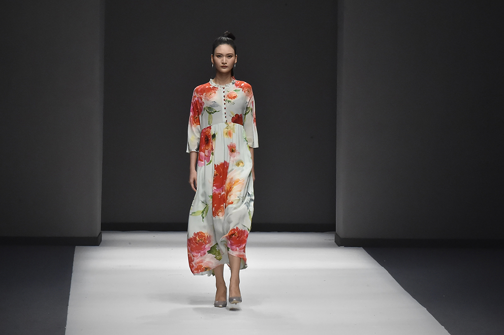 模特正在展示品牌Sunshine見(jiàn)花開(kāi)的服裝花朵作為設(shè)計(jì)的一部分凸顯東方美感