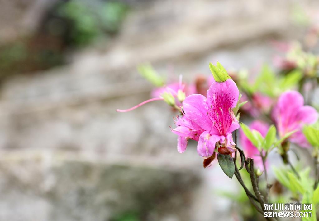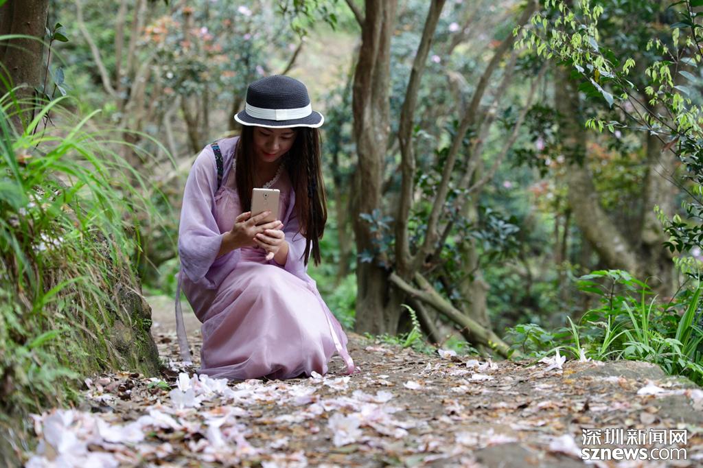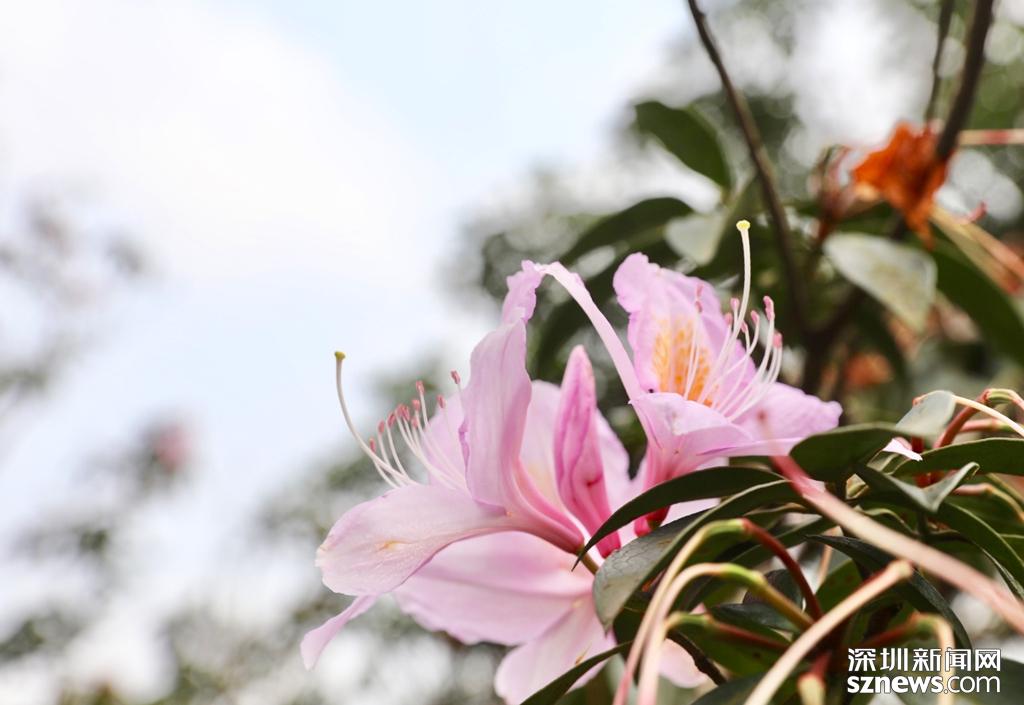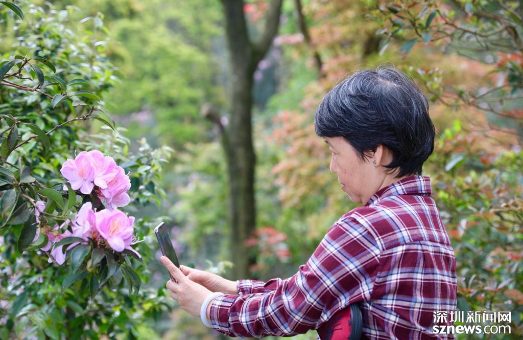 梧桐山成踏春賞花打卡點,市民用相機記錄下毛棉杜鵑之美。
